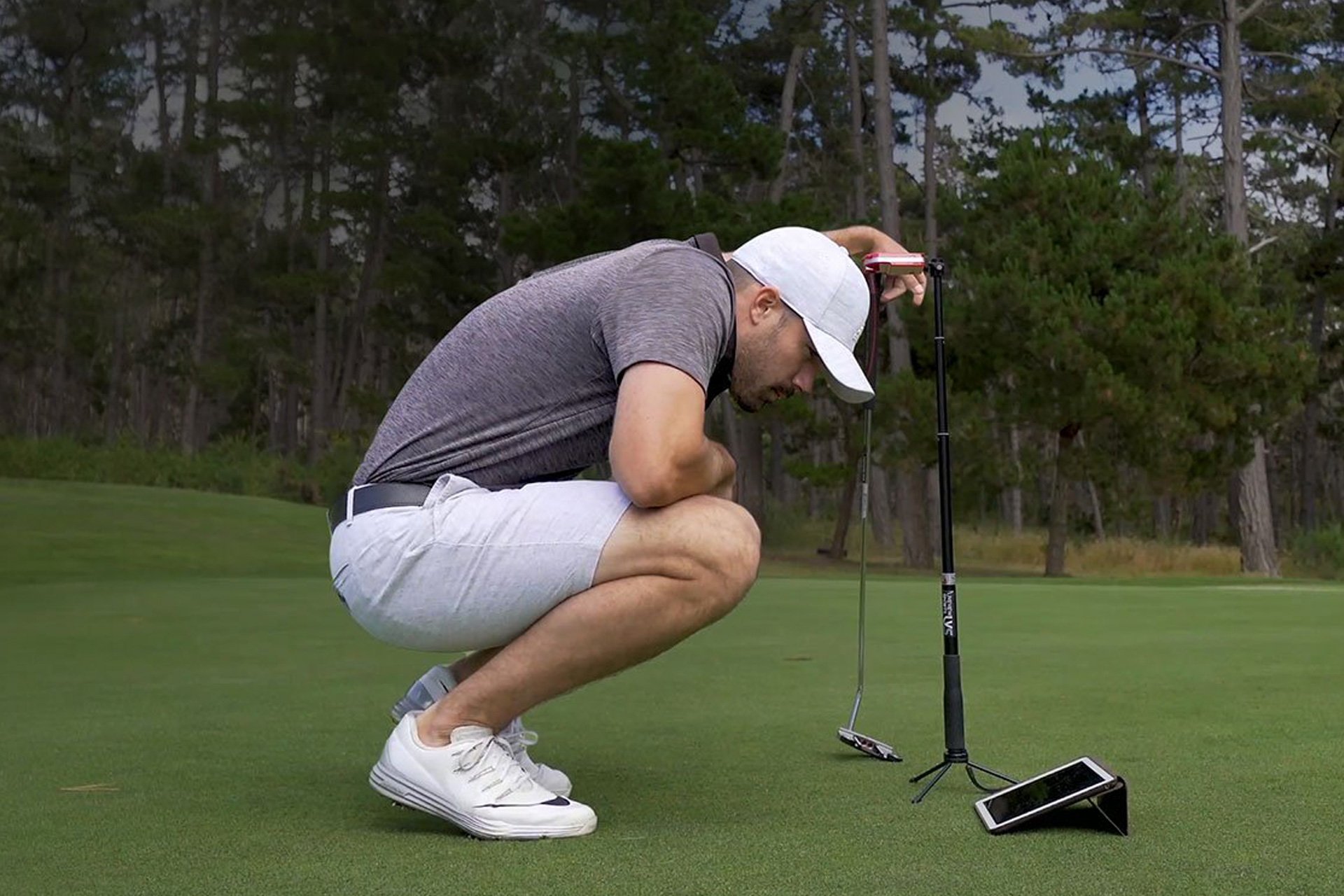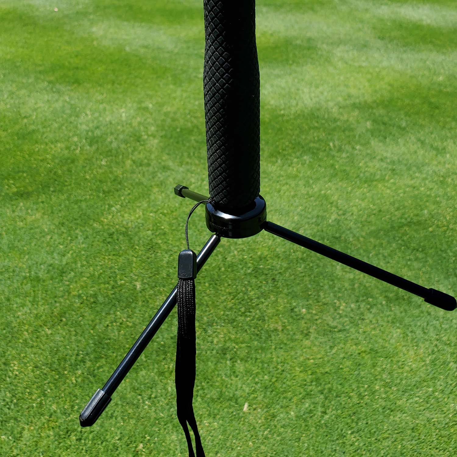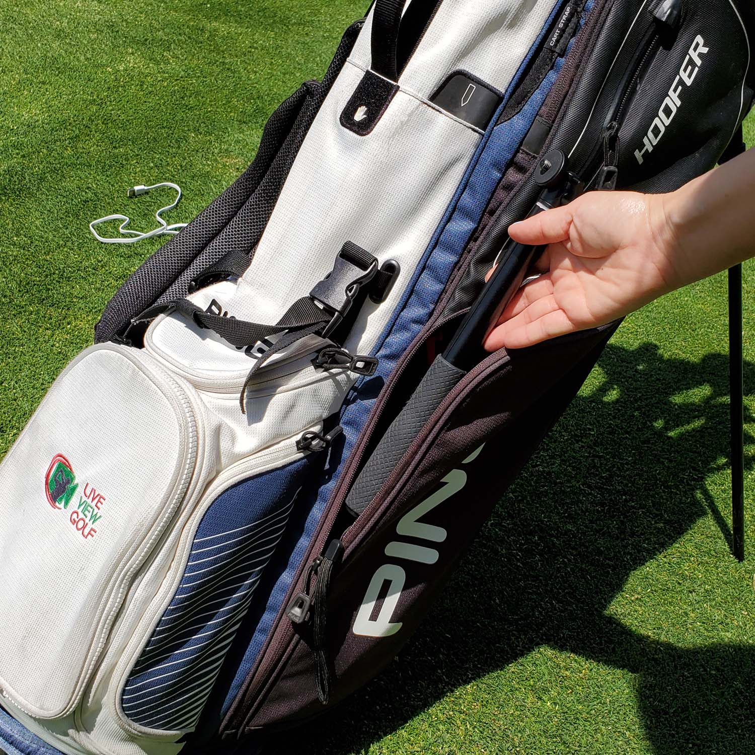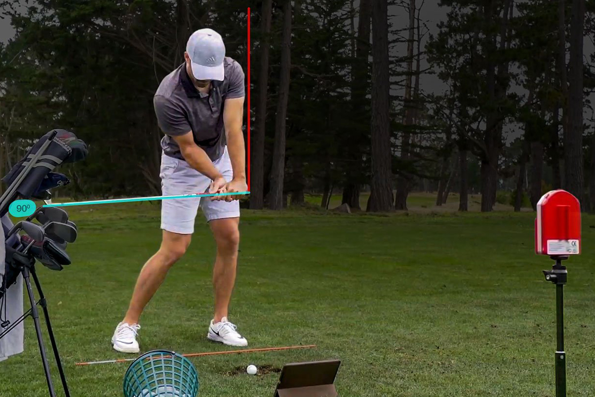 動画(英語)を参考に、アライメントスティックが画面中央に画面下辺と垂直になる位置にカメラを設置してください。そのアライメントスティックをスタンスとボールの間になるようにアドレスしていただくとカメラ位置がターゲットにスクウェアになりやすいです。短距離で全身を移すために左右が湾曲した魚眼レンズを採用していますので中央位置にターゲットラインを設定することがポイントです